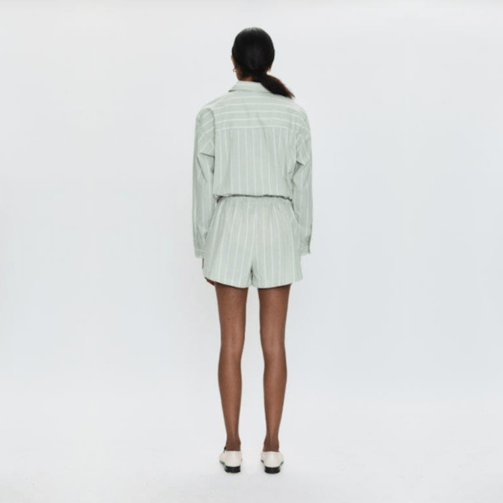 Stop and smell the flowers in this breezy, transitional romper crafted from lightweight cotton poplin. Designed with a collared, button up bodice that falls into a relaxed short silhouette with an adjustable drawstring waist. Roomy fit, consider sizing down.
