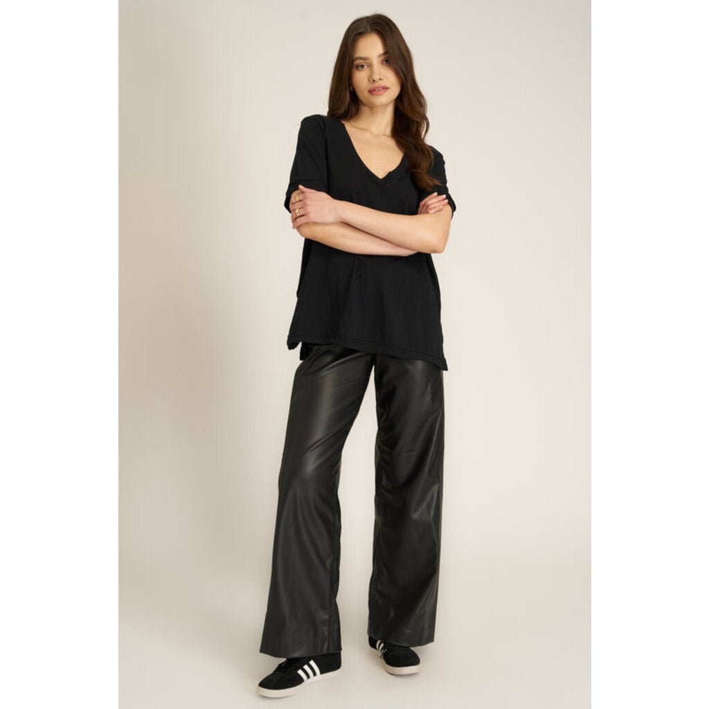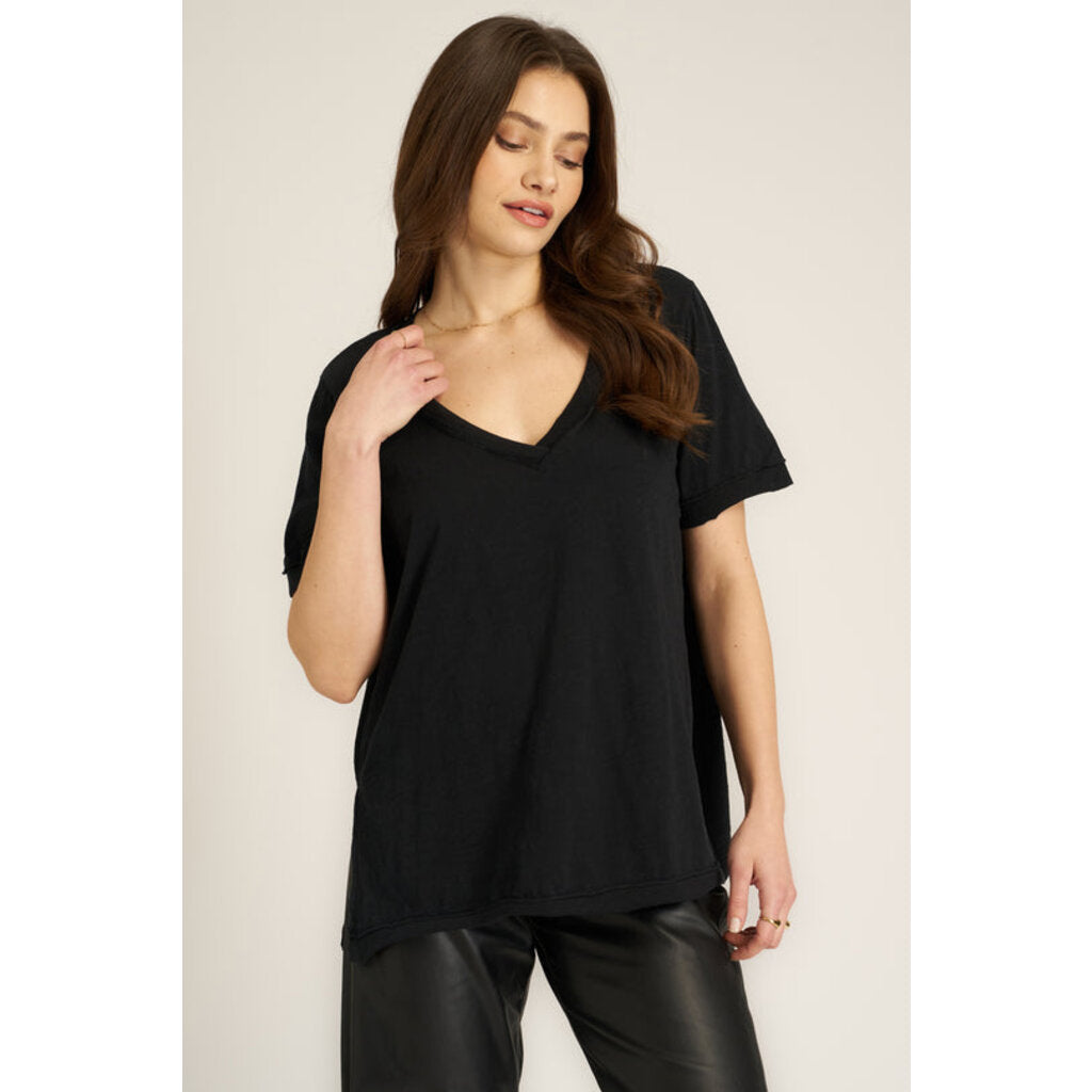 The Baltimore V Neck Tee features a v neckline, drop shoulders, curved hemline, and an overall easy fit. Made of a soft textured fabric with raw edges and exposed seaming, this one channels all the casual cool girl vibes.