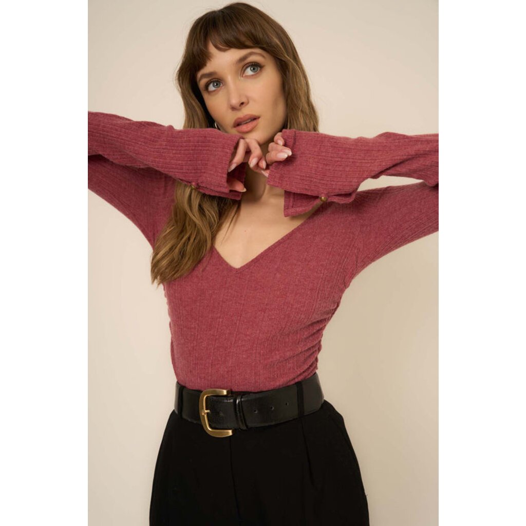 The Opal Ruched Side Brushed Rib V-Neck delivers warmth and style in one top. This long sleeve piece features a flattering v-neckline, side ruching for a tailored look, and flared sleeves with button details that add a playful touch.
