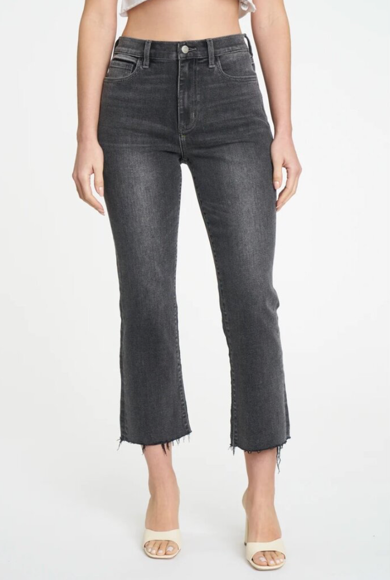 The Shy Girl is a high rise kick flare. MEASUREMENTS: 11" Rise 26" Inseam Super Stretch in 66% Cotton, 30% Repreve Recycled Polyester, 3% Viscose, 1% Spandex.