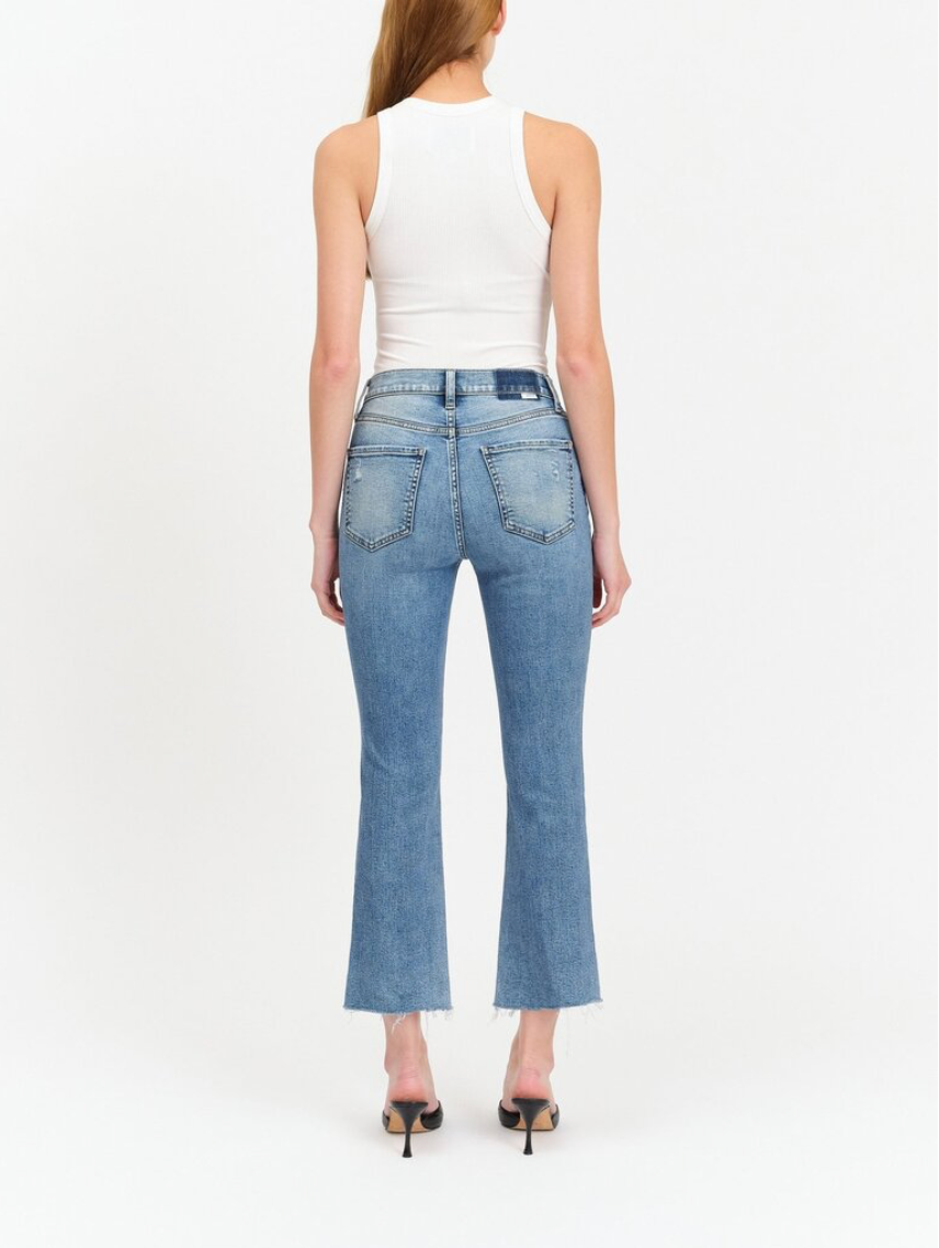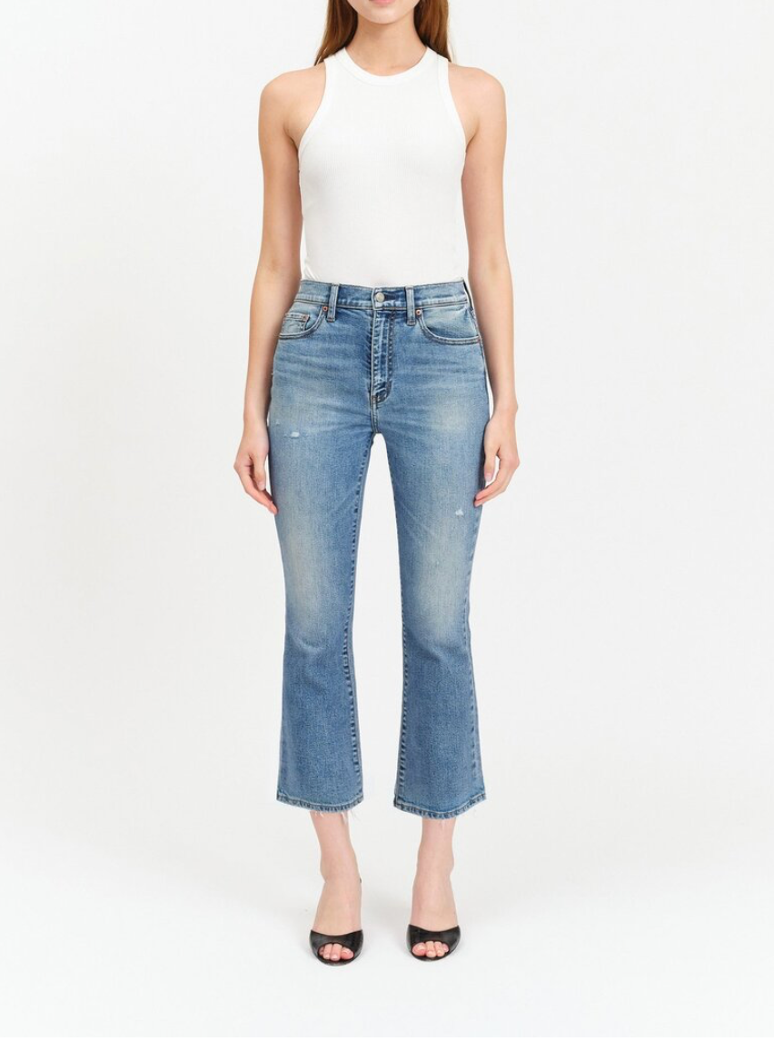 This cropped flare is made using Daze Denim's "Hug" denim. It is a slightly heavier fabric with a stretch that hugs your body, while smoothly cinching you in. In a medium wash with vintage fading, this is a core jean for your closet.